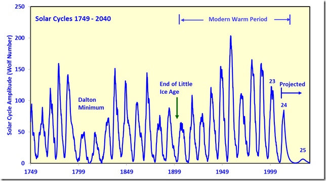 The actual sunspot record posted below shows that there is an increase in solar activity during last half of the 20th Century. During the latter part of that time period is when Earth’s climate has warmed. Since the 21st Century began, sunspot activity has dropped off and global temperatures haven’t risen for almost nineteen years. This is the global warming pause that the National Oceanic and Atmospheric Administration (NOAA) said doesn’t exist after intentionally changing data sets to reflect that.