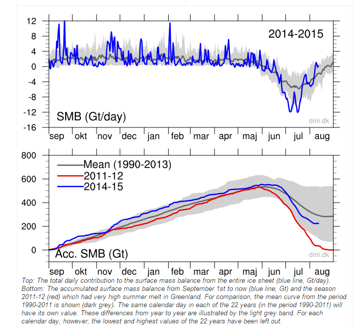 Climate science skeptic and blogger Tony Heller (aka Steven Goddard) has published another interesting post on his blog Real Climate Science that I will reproduce here with comments of my own. According to Heller, Greenland’s surface ice has been increasing in the past few days but, as it turns out, ended a month earlier than forecast.