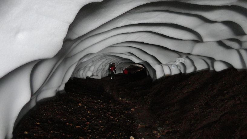 The magnificent arrangements result from water flowing underneath snow and ice as it begins to melt. As the water moves underneath the snow and ice, a channel of air forms melting the snow from under it. The result is a vast network of glacier caverns that are large enough for people to walk in and the caves are adorned with uneven wave patterns.