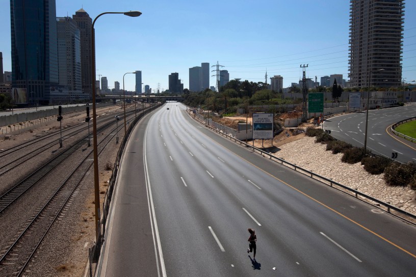 A woman runs along the car-free Ayalon expressway, during the holiday of Yom Kippur in Tel Aviv, Wednesday, Sept. 26, 2012. Israelis are marking the holiday of Yom Kippur, or 'Day of Atonement,' which is the holiest of Jewish holidays when observant Jews atone for the sins of the past year and the Israeli nation comes to almost a complete standstill. (AP Photo/Oded Balilty)