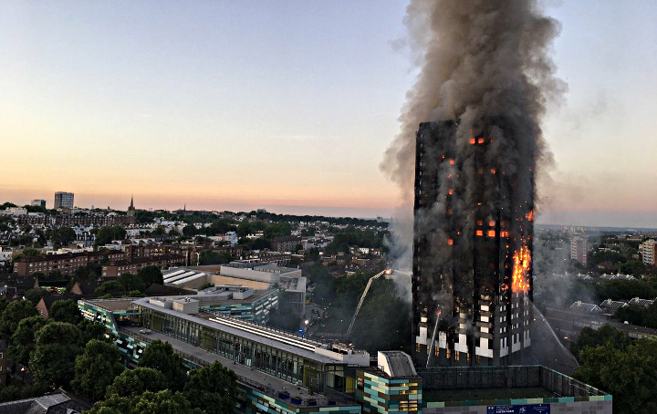 PHOTO CREDIT: Grenfell Tower fire in London. The edifice was renovated and pitched to be a model of environmental engineering until hundreds of people tragically lost their lives in a fire that consumed nearly the envire building.