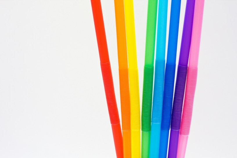 Eight brightly colored drinking straws positioned against a white background, each of them in its own color put together to resemble a rainbow. The plastic tubes have an accordion-like living hinge, making their head flexible.
