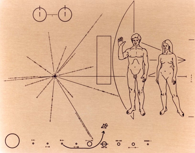 PHOTO CREDIT: By Designed by Carl Sagan and Frank Drake. Artwork prepared by Linda Salzman Sagan.Photograph by NASA Ames Resarch Center (NASA-ARC) – Ames Pioneer 10, Public Domain, https://commons.wikimedia.org/w/index.php?curid=1168194