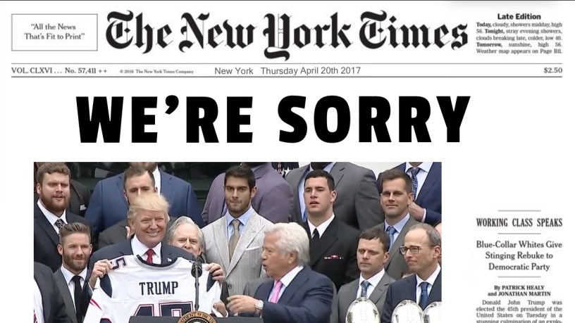 PHOTO CREDIT: A parody of The New York Times front page who apologized for their sloppy reporting of the 2016 election.