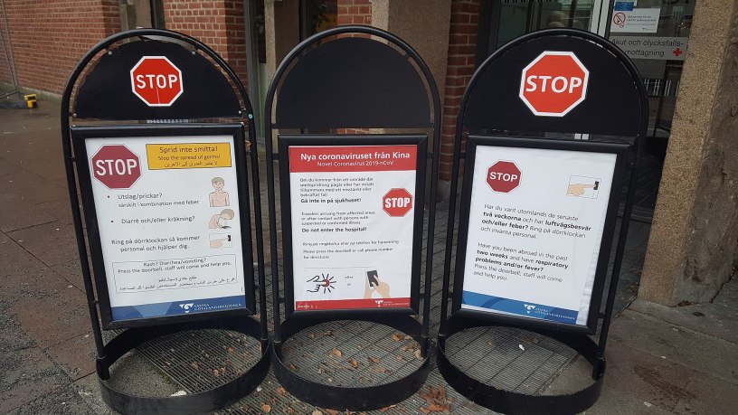 PHOTO CREDIT: Creative commons license – Streetsigns outside Sahlgrenska hospital from late February telling those with potential symptoms of COVID-19 to wait outside the hospital.