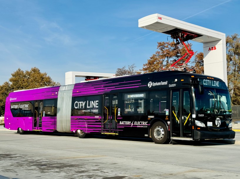PHOTO CREDIT: Spokane Transit Authority City Line 60-foot articulating New Flyer Xcelsior CHARGE battery electric bus charging via overhead ABB pantograph – By JTRamsey – Own work, CC BY-SA 4.0, https://commons.wikimedia.org/w/index.php?curid=139916474