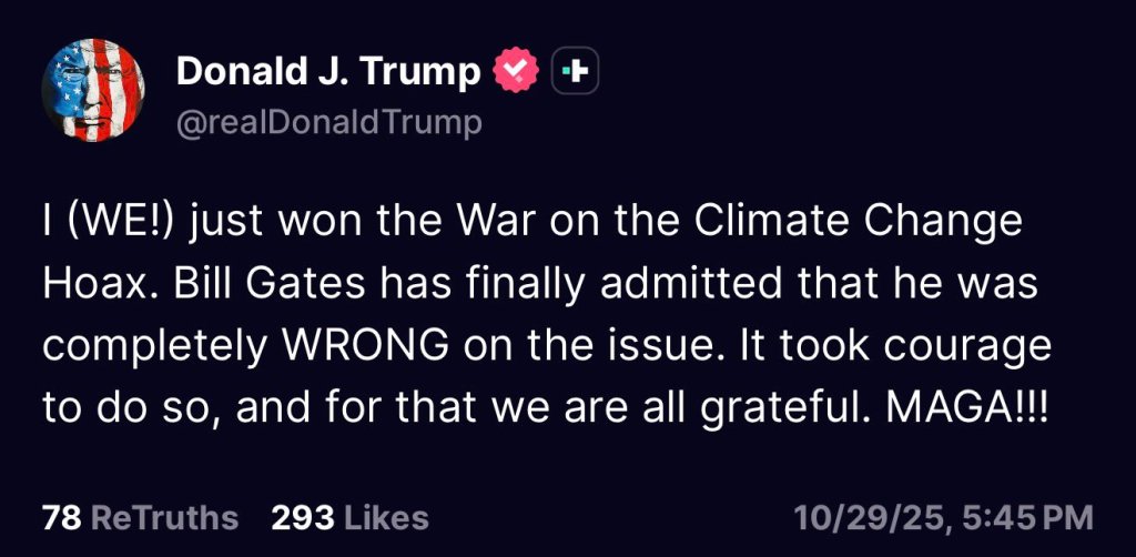 Trump posted this in reaction to Bill Gates backtracking on climate change. This triumph extends beyond MAGA to all Americans and humanity at large. Fossil fuels and nuclear power—scorned by climate alarmists—have been pivotal in delivering cost-effective, dependable energy, elevating global living standards through industrialization, technological progress, and universal access to electricity.
