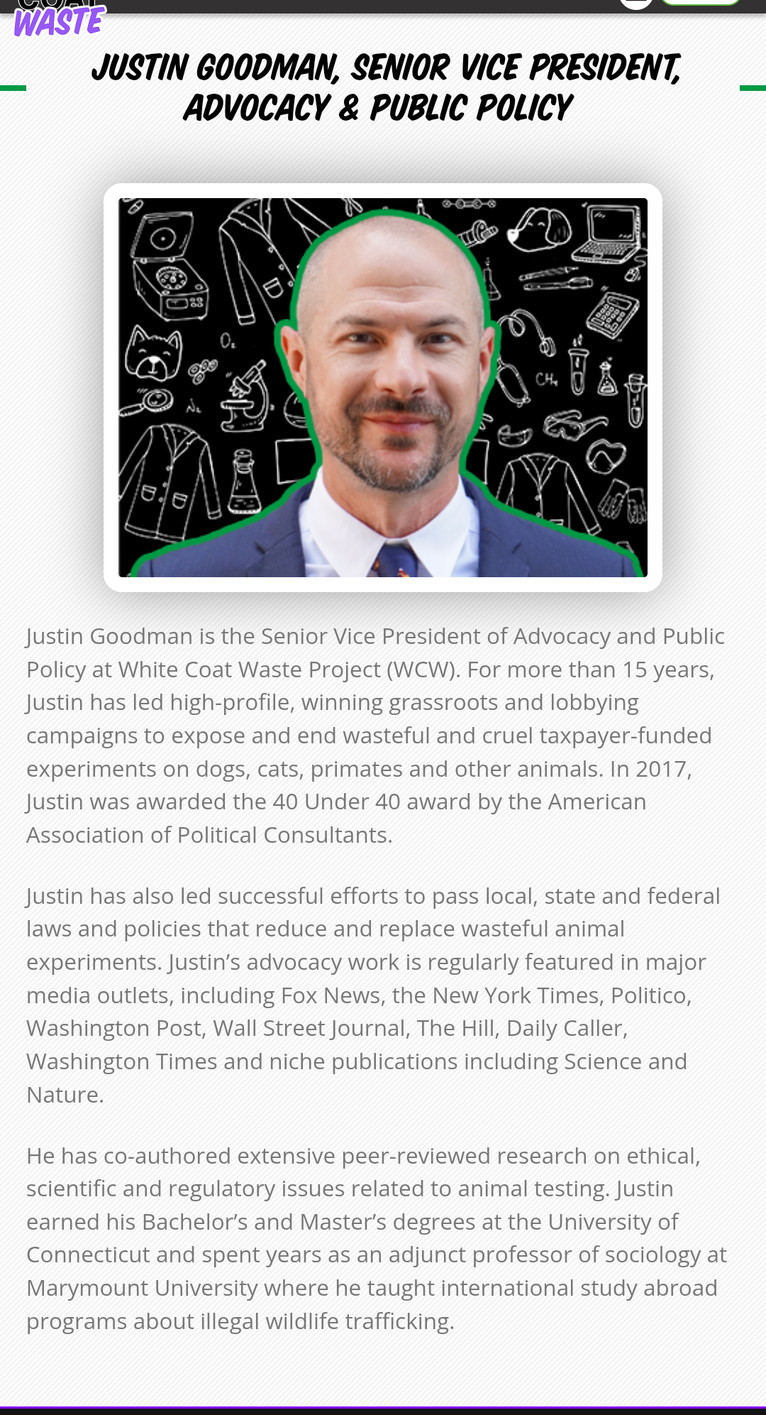 More proof that the so-called White Coat Waste Project is a PETA front group. As it turns out, their former Senior Vice President of Advocacy and Public Policy, Justin Goodman, was active with PETA. For some reason, this information is omitted on his bio on WCW’s website.