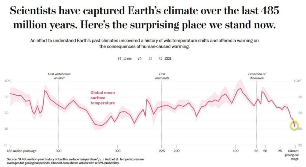 A little over a year ago, the journal Science published a paper co-authored by researchers from the University of Arizona and the University of Bristol. It revealed a blatant chink in the climate alarmist’s armor pointing out the global average temperature is 58.96°F (14.98°C), which is considerably cooler than the 96.8°F (36°C) average observed roughly 100 million years ago. That said, the study highlighted a steady decline in Earth’s temperatures over the past 50 million years.